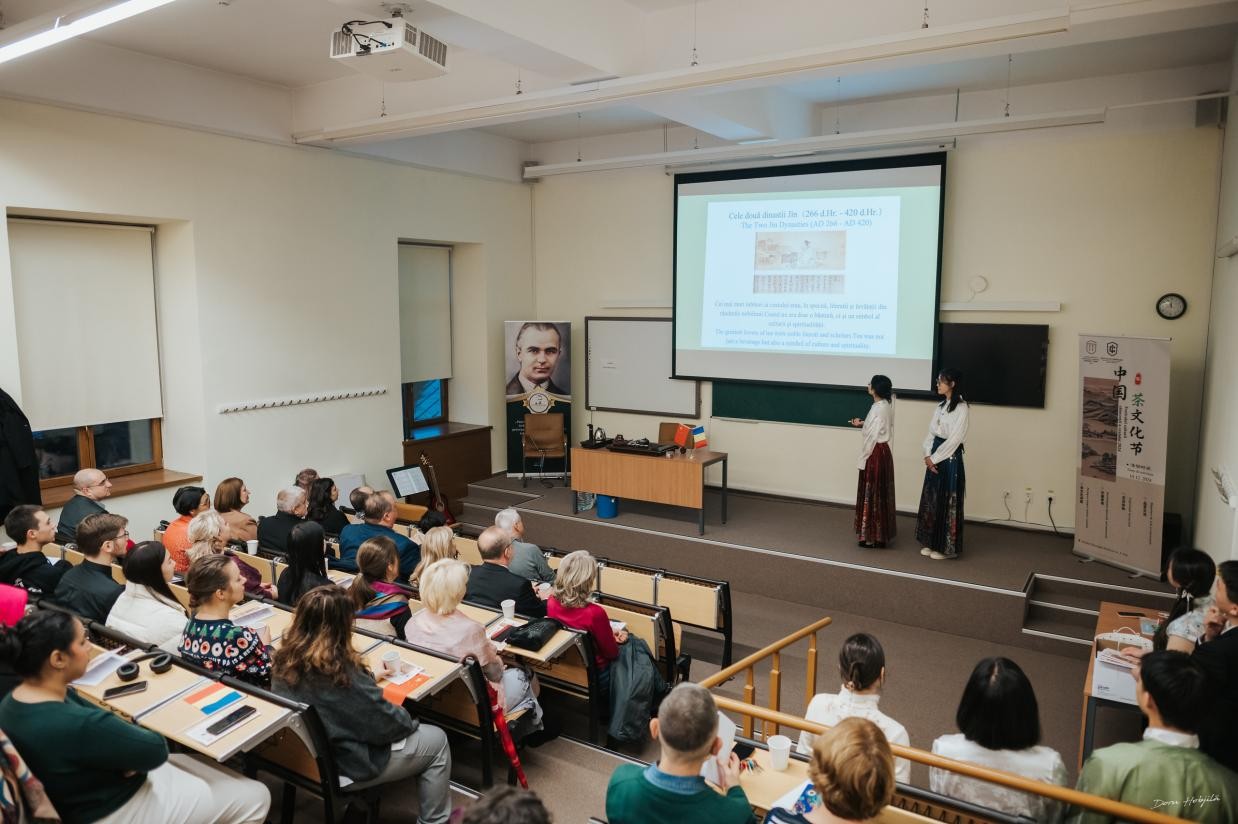 The event was hosted by the foreign director of the Confucius Institute, Mrs. Gabriela.Cuciurianu, and commenced with a speech by the university’s rector, Professor Viorel Scripcariu. In his address, Professor Viorel Scripcariu highlighted that this was the first Chinese cultural promotion event since the establishment of the Confucius Institute, making it a significant part of the university’s 145th-anniversary celebrations. He expressed his hope that through this event, students and faculty members in Iași would gain a deeper understanding of Chinese tea culture, appreciate its role as a bridge in international exchanges, and be inspired to learn Chinese and explore Chinese culture further.